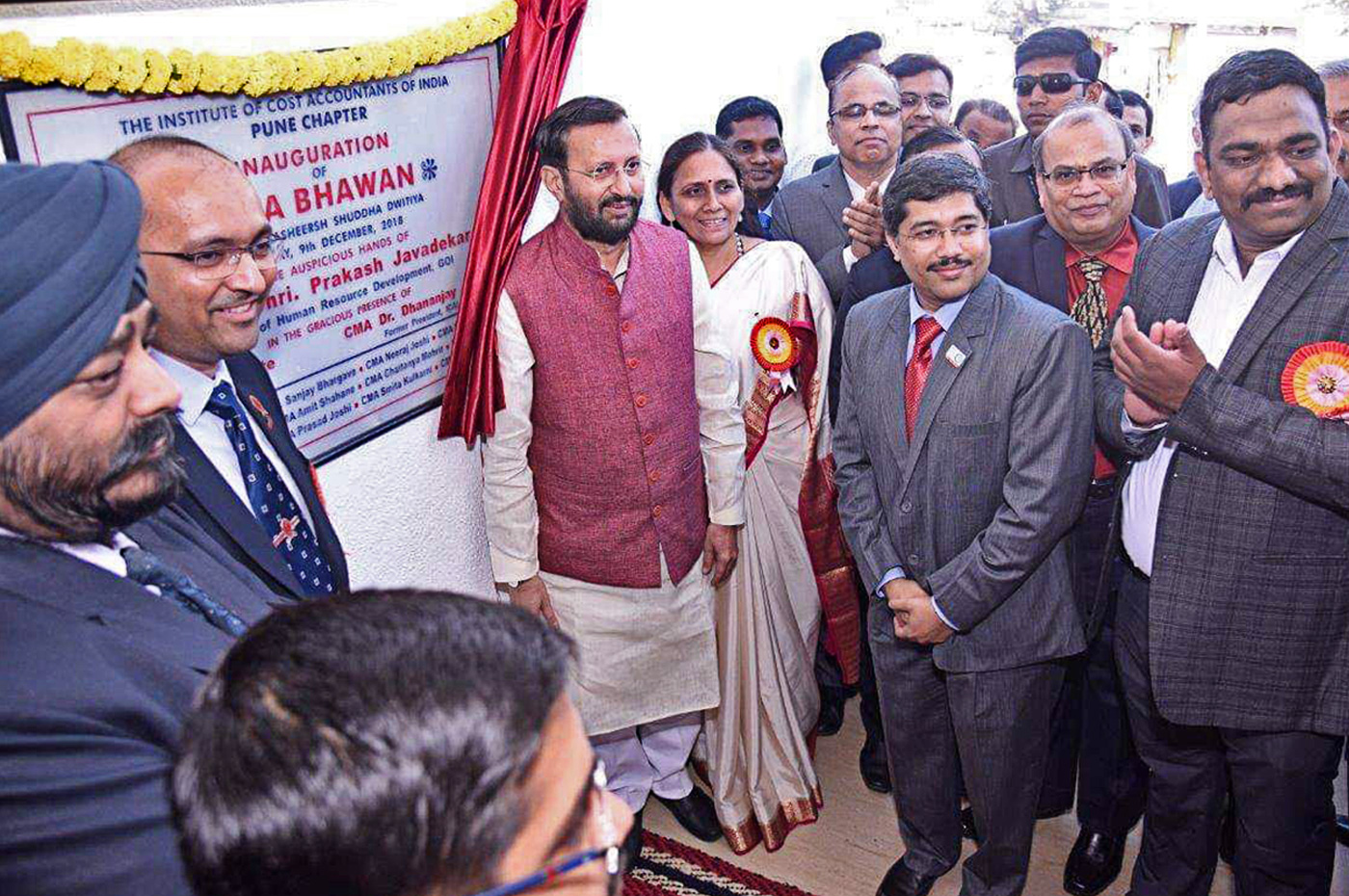 CMA Neeraj Joshi and CMA Meena Vaidya - Partners of our firm with Shri Prakash Jawadekar, Minister of Human Resource Development of GOI at the inauguration of CMA Bhavan, Pune on 9th December 2018
